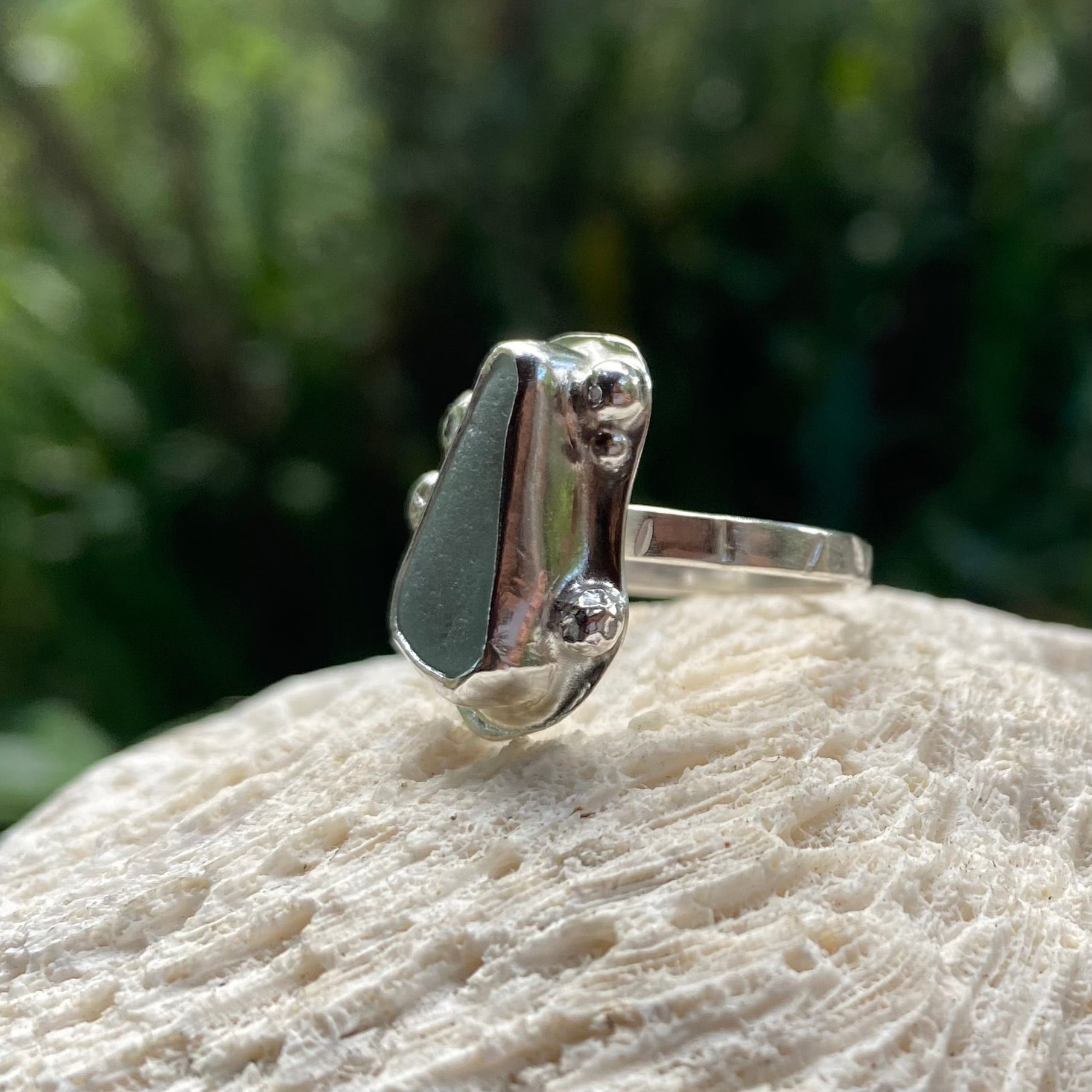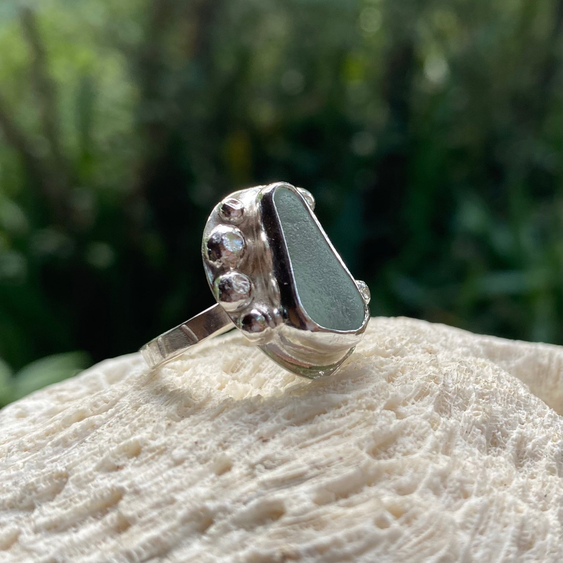 Mermaid Treasure Small White/Teal Sea Glass Ring with stamped line pattern on ring band.